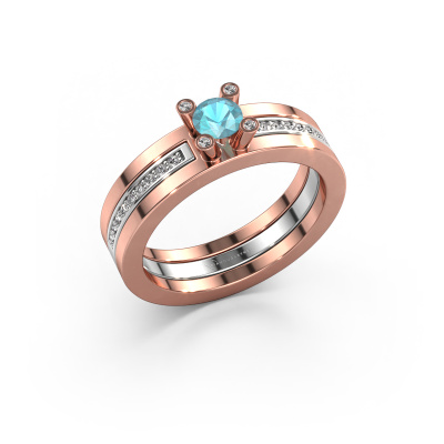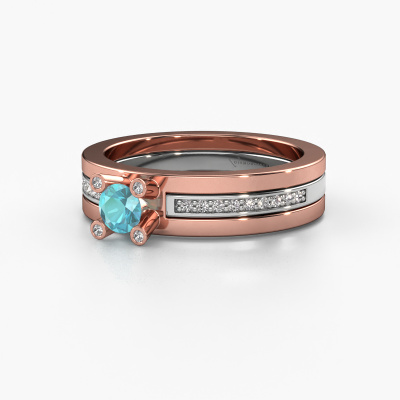 The ring shown above is called the Alisha. We call this type of ring a pavé solitaire ring because it has one centre gemstone and a band that is also pave set with gemstones. The 14 Carat rose gold engagement ring is set with a round 4 mm blue topaz centre stone and the band is pave set with diamond gemstones. Each jewel is unique in every way! Simply customize to your liking,This design rose gold pavé solitaire engagement ring has an exquisite round blue topaz centre stone. To further accentuate the centre stone, the band is fully set with more diamonds. Its open prong setting allows light to strike the blue topaz from various angles and this adds sparkle to your blue topaz ring. The photo shown above depicts the goldsmith's carefully handcrafted details of the ring. The high positioning of the centre stone is truly eye-catching. The perfect engagement ring for the crown jewel of your life! By using a combination of the latest modern techniques, combined with ancient crafting, we can make all our engagement rings in our own studio. Each jewel is made to order. This is advantageous because we can offer you a price you won't find anywhere else.Have you found a specific engagement ring somewhere which you would like to give to your loved one? Please feel free to express your wishes to our jewel designers because we would be honoured to turn your design into a design engagement ring. You can follow the development of your ring design because we use 3D drawings. This gives you a realistic preview of how your design will look. You can also preorder a dummy. A dummy is a plastic ring, which can be shaped according your ring design. You can try it on and check if its width and size are suitable for you. We will gladly send you a non-binding offer, based on a fair price/ quality ratio. It will amaze you, considering the quality of the ring and gemstones.To make it easier for you, we offer a 30 day return policy. Check our terms and conditions.