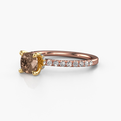 The ring shown above is called the Crystal CUS 4. We call this type of ring a pavé solitaire ring because it has one centre gemstone and a band that is also pave set with gemstones. The 14 Carat rose gold engagement ring is set with a cushion 1.00 crt brown diamond centre stone and the band is pave set with diamond gemstones. Each jewel is created to add sparkle to your finger, each jewel is lovingly made by hand by our goldsmiths.This chic rose gold pavé solitaire engagement ring has an exquisite cushion brown diamond centre stone. To further accentuate the centre stone, the band is fully set with more diamonds. Its open prong setting allows light to strike the brown diamond from various angles and this adds sparkle to your brown diamond ring. The photo shown above depicts the goldsmith's carefully handcrafted details of the ring. The high positioning of the centre stone is truly eye-catching. The perfect engagement ring for the crown jewel of your life! By using our modern techniques, we can design and customize the finest quality jewels with the utmost care for you. Our engagement rings are always priced 30 percent lower than other jewellers. We make engagement rings to order so we don't have to maintain a large stock. If you have a certain budget, we are more than happy to advice you accordingly.Do you have a specific ring in mind? One you came across somewhere. Please feel free to tell us your wishes and we will turn your design into a unique engagement ring. You can follow the development of your ring design because we use 3D drawings. This gives you a realistic preview of your design. We will gladly send you a non-binding offer, based on a fair price/ quality ratio. It will amaze you.To make it easier for you, we offer a 30 day return policy. Check our terms and conditions.