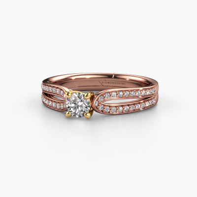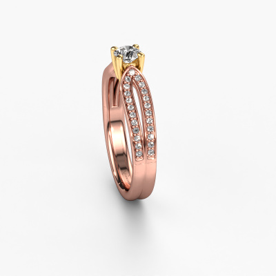 The ring shown above is called the Antonia rnd 2. We call this type of ring a pavé solitaire ring because it has one centre gemstone and a band that is also pave set with gemstones. The 14 Carat rose gold engagement ring is set with a round 0.30 crt diamond centre stone and the band is pave set with diamond gemstones. Each jewel is made just for you, with attention to detail and design.This traditional rose gold pavé solitaire engagement ring has an exquisite round diamond centre stone. To further accentuate the centre stone, the band is fully set with more diamonds. Its open prong setting allows light to strike the diamond from various angles and this adds sparkle to your diamond ring. The photo shown above depicts the goldsmith's carefully handcrafted details of the ring. The high positioning of the centre stone is truly eye-catching. The perfect engagement ring for the crown jewel of your life! After receiving your order, our goldsmiths will start the creative process of making your Antonia rnd 2 engagement ring. We don't keep stock. This is advantageous because these costs will not be passed on to you. Therefore, we can offer jewellery at exceptionally low prices.Have you found a specific engagement ring somewhere which you would like to give to your loved one? Please feel free to express your wishes to our jewel designers because we would be honoured to turn your design into a traditional engagement ring. You can follow the development of your ring design because we use 3D drawings. This gives you a realistic preview of how your design will look. You can also preorder a dummy. A dummy is a plastic ring, which can be shaped according your ring design. You can try it on and check if its width and size are suitable for you. We will gladly send you a non-binding offer, based on a fair price/ quality ratio. It will amaze you, considering the quality of the ring and gemstones.To make it easier for you, we offer a 30 day return policy. Check our terms and conditions.
