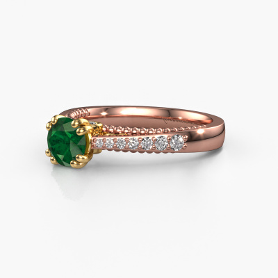 The ring shown above is called the Rozella. We call this type of ring a pavé solitaire ring because it has one centre gemstone and a band that is also pave set with gemstones. The 14 Carat rose gold engagement ring is set with a round 5.5 mm emerald centre stone and the band is pave set with lab grown diamond gemstones. Each jewel is made to shine bright around your finger. Each jewel is hand made with love by our goldsmiths.This unique rose gold pavé solitaire engagement ring has an exquisite round emerald centre stone. To further accentuate the centre stone, the band is fully set with more lab-grown diamonds. Its open prong setting allows light to strike the emerald from various angles and this adds sparkle to your emerald ring. The photo shown above depicts the goldsmith's carefully handcrafted details of the ring. The high positioning of the centre stone is truly eye-catching. The perfect engagement ring for the crown jewel of your life! After receiving your order, our goldsmiths will start the creative process of making your Rozella engagement ring. We don't keep stock. This is advantageous because these costs will not be passed on to you. Therefore, we can offer jewellery at exceptionally low prices.Our designers and goldsmiths work together each day, creating new jewels. Perhaps you have found a nice unique engagement ring somewhere, which can be used to customize your unique ring. Please feel free to contact us. We will make you an offer, based on a fair price/ quality ratio, which will amaze you.To make it easier for you, we offer a 30 day return policy. Check our terms and conditions.
