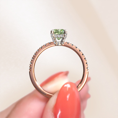 The ring shown above is called the Saskia 1 cus. We call this type of ring a pavé solitaire ring because it has one centre gemstone and a band that is also pave set with gemstones. The 14 Carat rose gold engagement ring is set with a cushion 5.5 mm green lab grown diamond centre stone and the band is pave set with diamond gemstones. Each jewel is made by a team of passionate goldsmiths and jewel designers. This will make your crown jewel truly eye-catching.This unique rose gold pavé solitaire engagement ring has an exquisite cushion green lab grown diamond centre stone. To further accentuate the centre stone, the band is fully set with more diamonds. Its open prong setting allows light to strike the green lab grown diamond from various angles and this adds sparkle to your green lab grown diamond ring. The photo shown above depicts the goldsmith's carefully handcrafted details of the ring. The high positioning of the centre stone is truly eye-catching. The perfect engagement ring for the crown jewel of your life! By using a combination of the latest modern techniques, combined with ancient crafting, we can make all our engagement rings in our own studio. Each jewel is made to order. This is advantageous because we can offer you a price you won't find anywhere else.Our team adds new designs to our online collection daily. Our designers and goldsmiths work together in creating the best design. We strive to offer a diverse collection of jewels. Perhaps you have a specific jewel design in mind. One you came across somewhere. Please contact us for a free consultation. We will make you an offer, based on a fair price/ quality ratio, that will baffle you.To make it easier for you, we offer a 30 day return policy. Check our terms and conditions.