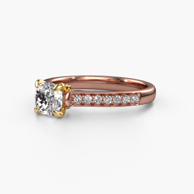 The ring shown above is called the Valorie cus 2. We call this type of ring a pavé solitaire ring because it has one centre gemstone and a band that is also pave set with gemstones. The 14 Carat rose gold engagement ring is set with a cushion 1.00 crt lab grown diamond centre stone and the band is pave set with diamond gemstones. Each jewel is made just for you by our master goldsmiths in our own studio.This traditional rose gold pavé solitaire engagement ring has an exquisite cushion lab grown diamond centre stone. To further accentuate the centre stone, the band is fully set with more diamonds. Its open prong setting allows light to strike the lab grown diamond from various angles and this adds sparkle to your lab grown diamond ring. The photo shown above depicts the goldsmith's carefully handcrafted details of the ring. The high positioning of the centre stone is truly eye-catching. The perfect engagement ring for the crown jewel of your life! By using a combination of the latest modern techniques, combined with ancient crafting, we can make all our engagement rings in our own studio. Each jewel is made to order. This is advantageous because we can offer you a price you won't find anywhere else.Our designers and goldsmiths work together each day, creating new jewels. Perhaps you have found a nice traditional engagement ring somewhere, which can be used to customize your unique ring. Please feel free to contact us. We will make you an offer, based on a fair price/ quality ratio, which will amaze you.To make it easier for you, we offer a 30 day return policy. Check our terms and conditions.