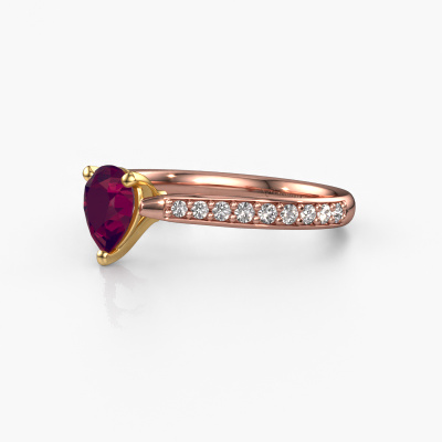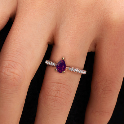 The ring shown above is called the Mignon per 2. We call this type of ring a pavé solitaire ring because it has one centre gemstone and a band that is also pave set with gemstones. The 14 Carat rose gold engagement ring is set with a pear 6.5x4.5 mm rhodolite centre stone and the band is pave set with diamond gemstones. Each jewel is made just for you by our master goldsmiths in our own studio.This trendy rose gold pavé solitaire engagement ring has an exquisite pear rhodolite centre stone. To further accentuate the centre stone, the band is fully set with more diamonds. Its open prong setting allows light to strike the rhodolite from various angles and this adds sparkle to your rhodolite ring. The photo shown above depicts the goldsmith's carefully handcrafted details of the ring. The high positioning of the centre stone is truly eye-catching. The perfect engagement ring for the crown jewel of your life! Are you on a budget? Please feel free to contact us, so we can go discuss your options. We offer our engagement rings at guaranteed best price, because we make them to order. You won't find such a price anywhere else!Our team adds new designs to our online collection daily. Our designers and goldsmiths work together in creating the best design. We strive to offer a diverse collection of jewels. Perhaps you have a specific jewel design in mind. One you came across somewhere. Please contact us for a free consultation. We will make you an offer, based on a fair price/ quality ratio, that will baffle you.To make it easier for you, we offer a 30 day return policy. Check our terms and conditions.