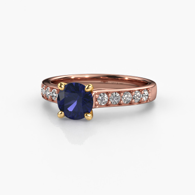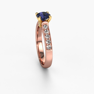 The ring shown above is called the Valorie RND 2. We call this type of ring a pavé solitaire ring because it has one centre gemstone and a band that is also pave set with gemstones. The 14 Carat rose gold engagement ring is set with a round 6.5 mm sapphire centre stone and the band is pave set with lab grown diamond gemstones. Each jewel is made just for you, with attention to detail and design.This modern rose gold pavé solitaire engagement ring has an exquisite round sapphire centre stone. To further accentuate the centre stone, the band is fully set with more lab-grown diamonds. Its open prong setting allows light to strike the sapphire from various angles and this adds sparkle to your sapphire ring. The photo shown above depicts the goldsmith's carefully handcrafted details of the ring. The high positioning of the centre stone is truly eye-catching. The perfect engagement ring for the crown jewel of your life! By using our modern techniques, we can design and customize the finest quality jewels with the utmost care for you. Our engagement rings are always priced 30 percent lower than other jewellers. We make engagement rings to order so we don't have to maintain a large stock. If you have a certain budget, we are more than happy to advice you accordingly.Our designers and goldsmiths work together each day, creating new jewels. Perhaps you have found a nice modern engagement ring somewhere, which can be used to customize your unique ring. Please feel free to contact us. We will make you an offer, based on a fair price/ quality ratio, which will amaze you.To make it easier for you, we offer a 30 day return policy. Check our terms and conditions.