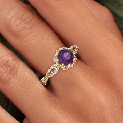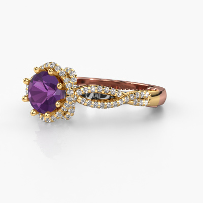 This 14 Carat rose gold ring is called Lysanne and is set with 6.5 mm amethyst. This filigree rose gold engagement ring is a true work of art! A beautifully adorned design of intricate wires. With dedication, patience and the utmost precision, our expert goldsmith will design a ring just for you. The adornment of small wiring is crafted to perfection by hand. It's a lengthy process which includes welding, crafting and polishing until our Goldsmiths are completely satisfied with the result: a perfect eye-catching ring that makes her shine with delight. Therefore the vintage filigree engagement ring is an extraordinary gift to bestow upon the love of your life. A handmade one-of-a-kind personalized ring, to be given to that special someone on that special moment when you pop the question. Isn't that wonderful? This piece of jewellery is made by a team of passionate goldsmiths and jewel designers. This will make your crown jewel truly eye-catching.After receiving your order, our goldsmiths will start the creative process of making your Lysanne engagement ring. We don't keep stock. This is advantageous because these costs will not be passed on to you. Therefore, we can offer jewellery at exceptionally low prices.Have you found a specific engagement ring somewhere which you would like to give to your loved one? Please feel free to express your wishes to our jewel designers because we would be honoured to turn your design into a vintage engagement ring. You can follow the development of your ring design because we use 3D drawings. This gives you a realistic preview of how your design will look. You can also preorder a dummy. A dummy is a plastic ring, which can be shaped according your ring design. You can try it on and check if its width and size are suitable for you. We will gladly send you a non-binding offer, based on a fair price/ quality ratio. It will amaze you, considering the quality of the ring and gemstones.To make it easier for you, we offer a 30 day return policy. Check our terms and conditions.