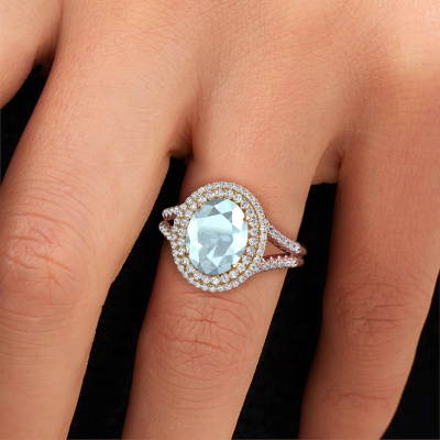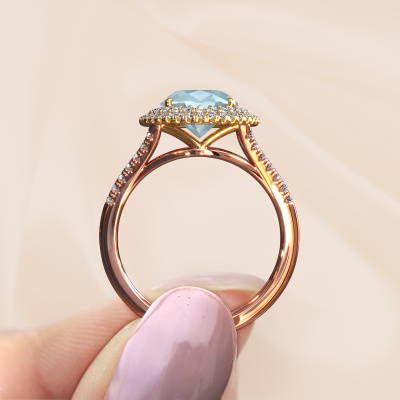 The ring shown above is called the Elvie. We call this type of ring a halo ring because it has one centre gemstone and a band that is also pave set with gemstones. The 14 Carat rose gold engagement ring is set with a oval 10x8 mm aquamarine centre stone and the band is pave set with lab-grown diamonds. What makes this vintage rose gold pavé solitaire ring special are the smaller sized stones embracing the centre stone. This gorgeous engagement ring is called a pavé solitaire ring because the smaller gemstones give the centre stone a pavé solitaire of surrounding light. In order for the smaller stones to enhance the centre stone, they have to be placed so there is no interference of light. And that's when our expert goldsmiths come in. Each individual stone is carefully set in the ring by hand. During manufacturing, light fall is constantly monitored to make sure the special pavé solitaire is still visible. In the end you get a unique engagement ring, with a aquamarine of your choosing at its centre. You can imagine the effect of a ring of such significance when you give it to her on her special day to shine. By using our modern techniques, we can design and customize the finest quality jewels with the utmost care for you. Our engagement rings are always priced 30 percent lower than other jewellers. We make engagement rings to order so we don't have to maintain a large stock. If you have a certain budget, we are more than happy to advice you accordingly.Do you have a specific ring in mind? One you came across somewhere. Please feel free to tell us your wishes and we will turn your design into a unique engagement ring. You can follow the development of your ring design because we use 3D drawings. This gives you a realistic preview of your design. We will gladly send you a non-binding offer, based on a fair price/ quality ratio. It will amaze you.To make it easier for you, we offer a 30 day return policy. Check our terms and conditions.