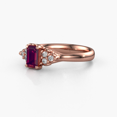This 14 Carat rose gold ring is called Myrna EME and is set with 6x4 mm rhodolite. This filigree rose gold engagement ring is a true work of art! A beautifully adorned design of intricate wires. With dedication, patience and the utmost precision, our expert goldsmith will design a ring just for you. The adornment of small wiring is crafted to perfection by hand. It's a lengthy process which includes welding, crafting and polishing until our Goldsmiths are completely satisfied with the result: a perfect eye-catching ring that makes her shine with delight. Therefore the vintage filigree engagement ring is an extraordinary gift to bestow upon the love of your life. A handmade one-of-a-kind personalized ring, to be given to that special someone on that special moment when you pop the question. Isn't that wonderful? This piece of jewellery is unique in every way! Simply customize to your likingBy using our modern techniques, we can design and customize the finest quality jewels with the utmost care for you. Our engagement rings are always priced 30 percent lower than other jewellers. We make engagement rings to order so we don't have to maintain a large stock. If you have a certain budget, we are more than happy to advice you accordingly.Have you found a specific engagement ring somewhere which you would like to give to your loved one? Please feel free to express your wishes to our jewel designers because we would be honoured to turn your design into a vintage engagement ring. You can follow the development of your ring design because we use 3D drawings. This gives you a realistic preview of how your design will look. You can also preorder a dummy. A dummy is a plastic ring, which can be shaped according your ring design. You can try it on and check if its width and size are suitable for you. We will gladly send you a non-binding offer, based on a fair price/ quality ratio. It will amaze you, considering the quality of the ring and gemstones.To make it easier for you, we offer a 30 day return policy. Check our terms and conditions.