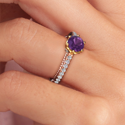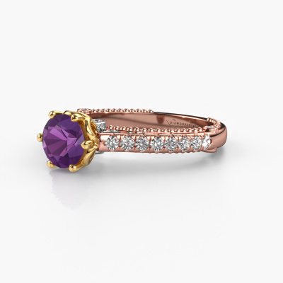 This 14 Carat rose gold ring is called Venita and is set with amethyst. An extraordinary rose gold vintage ring. One that will surely make the love of your life shine like a diamond! That is what we hope to achieve. This vintage engagement ring is set with exquisite amethysten. Whichever gemstone you choose from our selection, is up to you. The gemstone is selected with great care because we believe your engagement ring must be adorned with nothing but the most beautiful gemstone. Wouldn't you agree? Our expert goldsmith will design your ring in our own artisan studio, where the amethyst will be set with great precision. The ring will then be polished till it is absolutely perfect. Nothing but the best for the love of your life! This jewel is made just for you by our master goldsmiths in our own studio.After receiving your order, our goldsmiths will passionately start the creative process of making your engagement ring in our own studio. Because we don't have a big stockpile, these costs will not be passed on to you. Our pricing is proof of that! We offer top quality jewels at lowest price, guaranteed.Our team adds new designs to our online collection daily. Our designers and goldsmiths work together in creating the best design. We strive to offer a diverse collection of jewels. Perhaps you have a specific jewel design in mind. One you came across somewhere. Please contact us for a free consultation. We will make you an offer, based on a fair price/ quality ratio, that will baffle you.To make it easier for you, we offer a 30 day return policy. Check our terms and conditions.