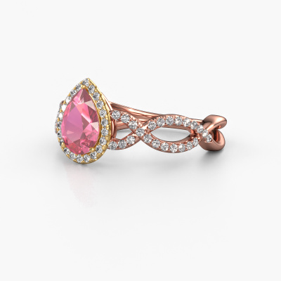 This 14 Carat rose gold ring is called Dionne pear and is set with 7x5 mm tourmaline pink. Does your girlfriend fancy exclusive jewellery? Or would you like to show her that she deserves the finest jewellery? This rose gold ring is pure craftsmanship, love and passion combined with the latest techniques coming together in perfect harmony. It requires a keen eye, patience and a skilful hand to mould this ring into perfection. Just the job for our expert goldsmith! The tourmaline pink set gemstones gives this rose gold ring an extra glamorous appearance. Customize the style of the twist engagement ring to her liking with a wide variety of precious metals and gemstones which you select. That is how you create a unique ring for the most exclusive woman in your life! This jewel is created to add sparkle to your finger, each jewel is lovingly made by hand by our goldsmiths.Are you on a budget? Please feel free to contact us, so we can go discuss your options. We offer our engagement rings at guaranteed best price, because we make them to order. You won't find such a price anywhere else!Different styles of new rings are made daily by our team. Perhaps you have found a pavé solitaire engagement ring somewhere. One you would like to give to your loved one. Please feel free to share your thoughts and design with our jewel designers. We would love to turn your design into a exclusive engagement ring. You can follow the development of your ring design because we use very detailed 3D drawings. On top of that, you can order a dummy of the design. A dummy is a plastic ring, which can be shaped according your ring design. You can try it on and check if the engagement ring is up to standard. We will gladly send you a non-binding offer, based on a fair price/ quality ratio. The offer will baffle you, considering the quality of the ring and gemstones.To make it easier for you, we offer a 30 day return policy. Check our terms and conditions.
