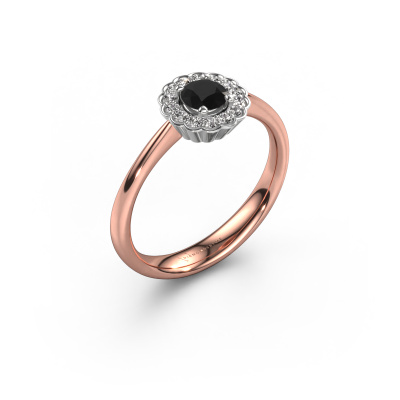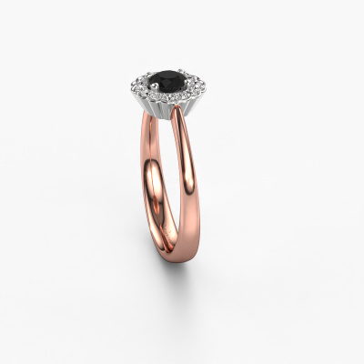 The ring shown above is called the Debi. We call this type of ring a halo ring because it has one centre gemstone and a band that is also pave set with gemstones. The 14 Carat rose gold engagement ring is set with a round 0.36 crt black diamond centre stone and the band is pave set with diamonds. What makes this classic rose gold halo ring special are the smaller sized stones embracing the centre stone. This gorgeous engagement ring is called a halo ring because the smaller gemstones give the centre stone a halo of surrounding light. In order for the smaller stones to enhance the centre stone, they have to be placed so there is no interference of light. And that's when our expert goldsmiths come in. Each individual stone is carefully set in the ring by hand. During manufacturing, light fall is constantly monitored to make sure the special halo is still visible. In the end you get a unique engagement ring, with a black diamond of your choosing at its centre. You can imagine the effect of a ring of such significance when you give it to her on her special day to shine. Because we design and deliver our own rings, we can offer you a engagement ring at a price you won't find anywhere else. A ring is made to order, which helps prevent excess supplies, so we can make you a great price offer. We understand it feels risky, buying your engagement ring online, but we will gladly assist in the designing process, taking your budget into consideration.Our team adds new designs to our online collection daily. Our designers and goldsmiths work together in creating the best design. We strive to offer a diverse collection of jewels. Perhaps you have a specific jewel design in mind. One you came across somewhere. Please contact us for a free consultation. We will make you an offer, based on a fair price/ quality ratio, that will baffle you.To make it easier for you, we offer a 30 day return policy. Check our terms and conditions.