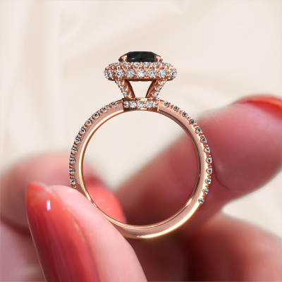 The ring shown above is called the Talitha RND. We call this type of ring a halo ring because it has one centre gemstone and a band that is also pave set with gemstones. The 14 Carat rose gold engagement ring is set with a round 1.30 crt black diamond centre stone and the band is pave set with lab-grown diamonds. What makes this exclusive rose gold halo ring special are the smaller sized stones embracing the centre stone. This gorgeous engagement ring is called a halo ring because the smaller gemstones give the centre stone a halo of surrounding light. In order for the smaller stones to enhance the centre stone, they have to be placed so there is no interference of light. And that's when our expert goldsmiths come in. Each individual stone is carefully set in the ring by hand. During manufacturing, light fall is constantly monitored to make sure the special halo is still visible. In the end you get a unique engagement ring, with a black diamond of your choosing at its centre. You can imagine the effect of a ring of such significance when you give it to her on her special day to shine. Are you on a budget? Please feel free to contact us, so we can go discuss your options. We offer our engagement rings at guaranteed best price, because we make them to order. You won't find such a price anywhere else!Our team adds new designs to our online collection daily. Our designers and goldsmiths work together in creating the best design. We strive to offer a diverse collection of jewels. Perhaps you have a specific jewel design in mind. One you came across somewhere. Please contact us for a free consultation. We will make you an offer, based on a fair price/ quality ratio, that will baffle you.To make it easier for you, we offer a 30 day return policy. Check our terms and conditions.