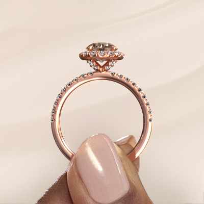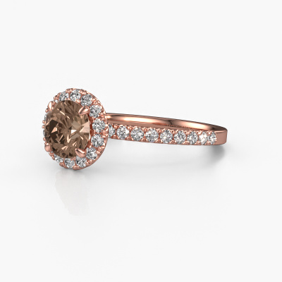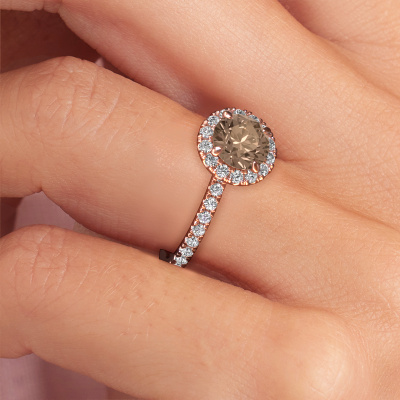 The ring shown above is called the Miranda rnd. We call this type of ring a halo ring because it has one centre gemstone and a band that is also pave set with gemstones. The 14 Carat rose gold engagement ring is set with a round 1.00 crt brown diamond centre stone and the band is pave set with lab-grown diamonds. What makes this exclusive rose gold halo ring special are the smaller sized stones embracing the centre stone. This gorgeous engagement ring is called a halo ring because the smaller gemstones give the centre stone a halo of surrounding light. In order for the smaller stones to enhance the centre stone, they have to be placed so there is no interference of light. And that's when our expert goldsmiths come in. Each individual stone is carefully set in the ring by hand. During manufacturing, light fall is constantly monitored to make sure the special halo is still visible. In the end you get a unique engagement ring, with a brown diamond of your choosing at its centre. You can imagine the effect of a ring of such significance when you give it to her on her special day to shine. By using our modern techniques, we can design and customize the finest quality jewels with the utmost care for you. Our engagement rings are always priced 30 percent lower than other jewellers. We make engagement rings to order so we don't have to maintain a large stock. If you have a certain budget, we are more than happy to advice you accordingly.Have you found a specific engagement ring somewhere which you would like to give to your loved one? Please feel free to express your wishes to our jewel designers because we would be honoured to turn your design into a exclusive engagement ring. You can follow the development of your ring design because we use 3D drawings. This gives you a realistic preview of how your design will look. You can also preorder a dummy. A dummy is a plastic ring, which can be shaped according your ring design. You can try it on and check if its width and size are suitable for you. We will gladly send you a non-binding offer, based on a fair price/ quality ratio. It will amaze you, considering the quality of the ring and gemstones.To make it easier for you, we offer a 30 day return policy. Check our terms and conditions.