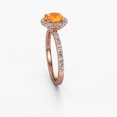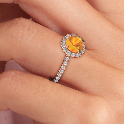 The ring shown above is called the Miranda rnd. We call this type of ring a halo ring because it has one centre gemstone and a band that is also pave set with gemstones. The 14 Carat rose gold engagement ring is set with a round 6.5 mm citrin centre stone and the band is pave set with lab-grown diamonds. What makes this exclusive rose gold halo ring special are the smaller sized stones embracing the centre stone. This gorgeous engagement ring is called a halo ring because the smaller gemstones give the centre stone a halo of surrounding light. In order for the smaller stones to enhance the centre stone, they have to be placed so there is no interference of light. And that's when our expert goldsmiths come in. Each individual stone is carefully set in the ring by hand. During manufacturing, light fall is constantly monitored to make sure the special halo is still visible. In the end you get a unique engagement ring, with a citrin of your choosing at its centre. You can imagine the effect of a ring of such significance when you give it to her on her special day to shine. By using our modern techniques, we can design and customize the finest quality jewels with the utmost care for you. Our engagement rings are always priced 30 percent lower than other jewellers. We make engagement rings to order so we don't have to maintain a large stock. If you have a certain budget, we are more than happy to advice you accordingly.Have you found a specific engagement ring somewhere which you would like to give to your loved one? Please feel free to express your wishes to our jewel designers because we would be honoured to turn your design into a exclusive engagement ring. You can follow the development of your ring design because we use 3D drawings. This gives you a realistic preview of how your design will look. You can also preorder a dummy. A dummy is a plastic ring, which can be shaped according your ring design. You can try it on and check if its width and size are suitable for you. We will gladly send you a non-binding offer, based on a fair price/ quality ratio. It will amaze you, considering the quality of the ring and gemstones.To make it easier for you, we offer a 30 day return policy. Check our terms and conditions.
