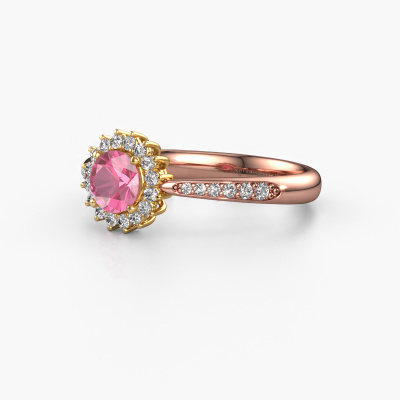 The ring shown above is called the Tilly RND 2. We call this type of ring a cluster ring, the centre gemstone is surrounded by smaller sized stones. This 14 Carat rose gold version is set with a 5 mm round pink sapphire centre stone, embraced by smaller diamonds. If you look at this rose gold cluster engagement ring, you might get the impression that its smaller sized stones collide with the bigger pink sapphire, so it is shaped like a flower. Therefore this engagement ring is also known as the flower ring. Our artisan goldsmiths get the job done. Each individual stone is carefully set by hand. During manufacturing, light fall is constantly monitored to make sure the special cluster effect is still visible. In the end you get the perfect engagement ring with a radiant pink sapphire gemstone centrepiece. You can imagine the effect of a ring of such significance when you give tot the love of your life on her special day to shine. After receiving your order, our goldsmiths will start the creative process of making your Tilly RND 2 engagement ring. We don't keep stock. This is advantageous because these costs will not be passed on to you. Therefore, we can offer jewellery at exceptionally low prices.Our team adds new designs to our online collection daily. Our designers and goldsmiths work together in creating the best design. We strive to offer a diverse collection of jewels. Perhaps you have a specific jewel design in mind. One you came across somewhere. Please contact us for a free consultation. We will make you an offer, based on a fair price/ quality ratio, that will baffle you.To make it easier for you, we offer a 30 day return policy. Check our terms and conditions.