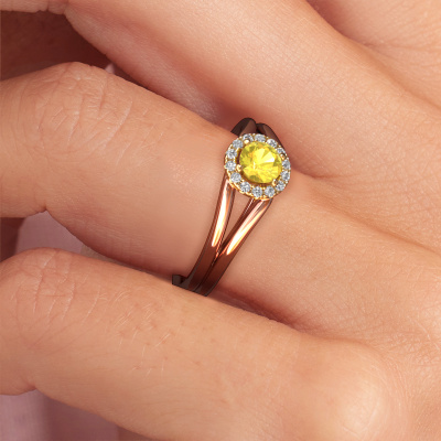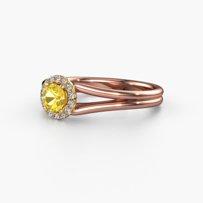 The ring shown above is called the Verla rnd 1. We call this type of ring a halo ring because it has one centre gemstone and a band that is also pave set with gemstones. The 14 Carat rose gold engagement ring is set with a round 4.7 mm yellow sapphire centre stone and the band is pave set with diamonds. What makes this classic rose gold halo ring special are the smaller sized stones embracing the centre stone. This gorgeous engagement ring is called a halo ring because the smaller gemstones give the centre stone a halo of surrounding light. In order for the smaller stones to enhance the centre stone, they have to be placed so there is no interference of light. And that's when our expert goldsmiths come in. Each individual stone is carefully set in the ring by hand. During manufacturing, light fall is constantly monitored to make sure the special halo is still visible. In the end you get a unique engagement ring, with a yellow sapphire of your choosing at its centre. You can imagine the effect of a ring of such significance when you give it to her on her special day to shine. By using a combination of the latest modern techniques, combined with ancient crafting, we can make all our engagement rings in our own studio. Each jewel is made to order. This is advantageous because we can offer you a price you won't find anywhere else.Our team adds new designs to our online collection daily. Our designers and goldsmiths work together in creating the best design. We strive to offer a diverse collection of jewels. Perhaps you have a specific jewel design in mind. One you came across somewhere. Please contact us for a free consultation. We will make you an offer, based on a fair price/ quality ratio, that will baffle you.To make it easier for you, we offer a 30 day return policy. Check our terms and conditions.