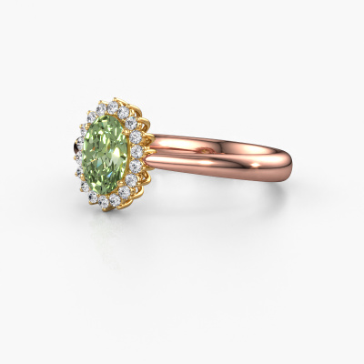 The ring shown above is called the Tilly ovl 1. We call this type of ring a cluster ring, the centre gemstone is surrounded by smaller sized stones. This 14 Carat rose gold version is set with a 7x5 mm oval green lab grown diamond centre stone, embraced by smaller lab-grown diamonds. The classic rose gold cluster engagement ring stands out because of its shape. Together, the smaller and bigger sized green lab grown diamond gemstones form a flower and they appear to collide into one big sparkling gem. This classic engagement ring is also known as the flower ring. Our expert Goldsmiths make sure the smaller lab-grown diamonds stones are set identically so there is no light interference in the green lab grown diamond but unity instead. With perfect precision and a skilful hand each green lab grown diamond is set in the ring. During manufacturing, it is constantly monitored to make sure light reflects flawlessly. This results in a unique engagement ring, with a radiant green lab grown diamond at its centre. A lovely, meaningful gift to bestow upon the love of your life. By using a combination of the latest modern techniques, combined with ancient crafting, we can make all our engagement rings in our own studio. Each jewel is made to order. This is advantageous because we can offer you a price you won't find anywhere else.Do you have a specific ring in mind? One you came across somewhere. Please feel free to tell us your wishes and we will turn your design into a unique engagement ring. You can follow the development of your ring design because we use 3D drawings. This gives you a realistic preview of your design. We will gladly send you a non-binding offer, based on a fair price/ quality ratio. It will amaze you.To make it easier for you, we offer a 30 day return policy. Check our terms and conditions.