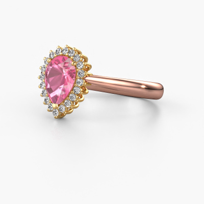 The ring shown above is called the Tilly per 1. We call this type of ring a cluster ring, the centre gemstone is surrounded by smaller sized stones. This 14 Carat rose gold version is set with a 8x6 mm pear pink sapphire centre stone, embraced by smaller diamonds. The exclusive rose gold cluster engagement ring stands out because of its shape. Together, the smaller and bigger sized pink sapphire gemstones form a flower and they appear to collide into one big sparkling gem. This exclusive engagement ring is also known as the flower ring. Our expert Goldsmiths make sure the smaller diamonds stones are set identically so there is no light interference in the pink sapphire but unity instead. With perfect precision and a skilful hand each pink sapphire is set in the ring. During manufacturing, it is constantly monitored to make sure light reflects flawlessly. This results in a unique engagement ring, with a radiant pink sapphire at its centre. A lovely, meaningful gift to bestow upon the love of your life. After receiving your order, our goldsmiths will start the creative process of making your Tilly per 1 engagement ring. We don't keep stock. This is advantageous because these costs will not be passed on to you. Therefore, we can offer jewellery at exceptionally low prices.Our team adds new designs to our online collection daily. Our designers and goldsmiths work together in creating the best design. We strive to offer a diverse collection of jewels. Perhaps you have a specific jewel design in mind. One you came across somewhere. Please contact us for a free consultation. We will make you an offer, based on a fair price/ quality ratio, that will baffle you.To make it easier for you, we offer a 30 day return policy. Check our terms and conditions.