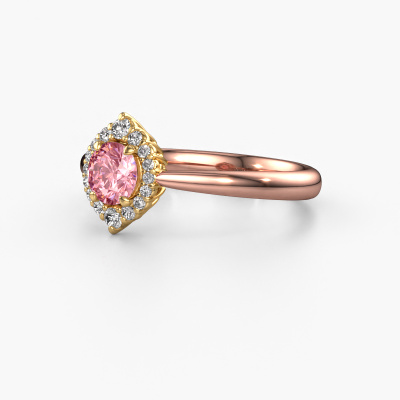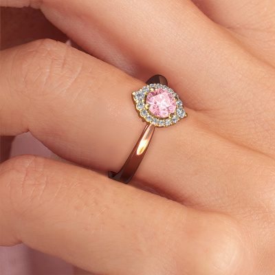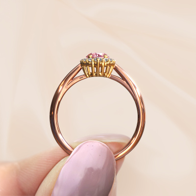 The ring shown above is called the Tora. We call this type of ring a cluster ring, the centre gemstone is surrounded by smaller sized stones. This 14 Carat rose gold version is set with a 5 mm round pink lab grown diamond centre stone, embraced by smaller lab-grown diamonds. The classic rose gold cluster engagement ring stands out because of its shape. Together, the smaller and bigger sized pink lab grown diamond gemstones form a flower and they appear to collide into one big sparkling gem. This classic engagement ring is also known as the flower ring. Our expert Goldsmiths make sure the smaller lab-grown diamonds stones are set identically so there is no light interference in the pink lab grown diamond but unity instead. With perfect precision and a skilful hand each pink lab grown diamond is set in the ring. During manufacturing, it is constantly monitored to make sure light reflects flawlessly. This results in a unique engagement ring, with a radiant pink lab grown diamond at its centre. A lovely, meaningful gift to bestow upon the love of your life. By using a combination of the latest modern techniques, combined with ancient crafting, we can make all our engagement rings in our own studio. Each jewel is made to order. This is advantageous because we can offer you a price you won't find anywhere else.Have you found a specific engagement ring somewhere which you would like to give to your loved one? Please feel free to express your wishes to our jewel designers because we would be honoured to turn your design into a classic engagement ring. You can follow the development of your ring design because we use 3D drawings. This gives you a realistic preview of how your design will look. You can also preorder a dummy. A dummy is a plastic ring, which can be shaped according your ring design. You can try it on and check if its width and size are suitable for you. We will gladly send you a non-binding offer, based on a fair price/ quality ratio. It will amaze you, considering the quality of the ring and gemstones.To make it easier for you, we offer a 30 day return policy. Check our terms and conditions.