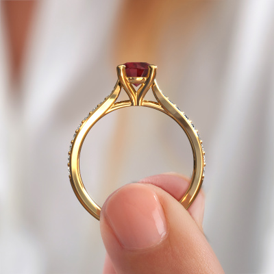 The ring shown above is called the Mignon rnd 2. We call this type of ring a pavé solitaire ring because it has one centre gemstone and a band that is also pave set with gemstones. The 14 Carat gold engagement ring is set with a round 6 mm ruby centre stone and the band is pave set with lab grown diamond gemstones. Each jewel is made by a team of passionate goldsmiths and jewel designers. This will make your crown jewel truly eye-catching.This luxury gold pavé solitaire engagement ring has an exquisite round ruby centre stone. To further accentuate the centre stone, the band is fully set with more lab-grown diamonds. Its open prong setting allows light to strike the ruby from various angles and this adds sparkle to your ruby ring. The photo shown above depicts the goldsmith's carefully handcrafted details of the ring. The high positioning of the centre stone is truly eye-catching. The perfect engagement ring for the crown jewel of your life! By using our modern techniques, we can design and customize the finest quality jewels with the utmost care for you. Our engagement rings are always priced 30 percent lower than other jewellers. We make engagement rings to order so we don't have to maintain a large stock. If you have a certain budget, we are more than happy to advice you accordingly.Different styles of new rings are made daily by our team. Perhaps you have found a pavé solitaire engagement ring somewhere. One you would like to give to your loved one. Please feel free to share your thoughts and design with our jewel designers. We would love to turn your design into a luxury engagement ring. You can follow the development of your ring design because we use very detailed 3D drawings. On top of that, you can order a dummy of the design. A dummy is a plastic ring, which can be shaped according your ring design. You can try it on and check if the engagement ring is up to standard. We will gladly send you a non-binding offer, based on a fair price/ quality ratio. The offer will baffle you, considering the quality of the ring and gemstones.To make it easier for you, we offer a 30 day return policy. Check our terms and conditions.