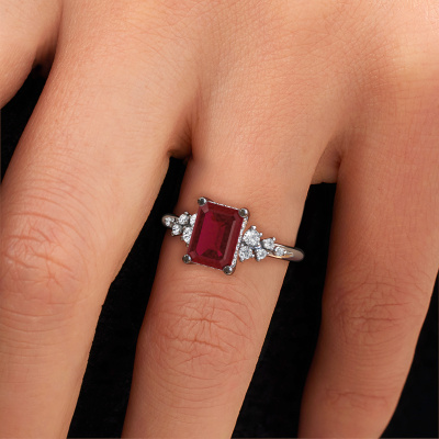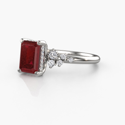 The ring shown above is called the Emma EME. We call this type of ring a pavé solitaire ring because it has one centre gemstone and a band that is also pave set with gemstones. This engagement ring is made in platinum set with a 8x6 mm emerald cut ruby, and pave set lab-grown diamonds at the sides. Each piece of jewellery is made with passion and love by one of our master goldsmiths.This fantasy platinum pavé solitaire engagement ring has an exquisite emerald cut ruby centre stone. To further accentuate the centre stone, the band is set full with more lab-grown diamonds. Its open prong setting allows light to strike the ruby from various angles and this adds sparkle to your ruby ring. The photo shown above depicts the goldsmith's carefully handcrafted details of the ring. The high positioning of the centre stone is truly eye-catching. The perfect engagement ring for the crown jewel of your life!After receiving your order, our goldsmiths will passionately start the creative process of making your engagement ring in our own studio. Because we don't have a big stockpile, these costs will not be passed on to you. Our pricing is proof of that! We offer top quality jewels at lowest price, guaranteed.Our team adds new designs to our online collection daily. Our designers and goldsmiths work together in creating the best design. We strive to offer a diverse collection of jewels. Perhaps you have a specific jewel design in mind. One you came across somewhere. Please contact us for a free consultation. We will make you an offer, based on a fair price/ quality ratio, that will baffle you.To make it easier for you, we offer a 30 day return policy. Check our terms and conditions.