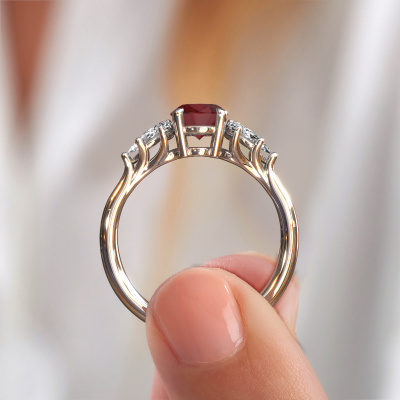 This platinum ring is called Fiona OVL and is set with ruby. How would you describe the style of the love of your life? Does she have a unique sense of style? This stunning beautiful platinum engagement ring can be custom-made to your own or her liking. Our ruby gemstones have been carefully selected because we believe your unique engagement ring must be adorned with nothing but the most beautiful gemstone. Don't you agree? This jewel is made just for you, with attention to detail and design.By using a combination of the latest modern techniques, combined with ancient crafting, we can make all our engagement rings in our own studio. Each jewel is made to order. This is advantageous because we can offer you a price you won't find anywhere else.Our designers and goldsmiths work together each day, creating new jewels. Perhaps you have found a nice unique engagement ring somewhere, which can be used to customize your unique ring. Please feel free to contact us. We will make you an offer, based on a fair price/ quality ratio, which will amaze you.To make it easier for you, we offer a 30 day return policy. Check our terms and conditions.