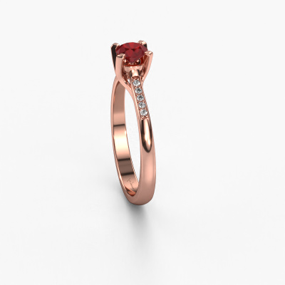 The ring shown above is called the Isa 2. We call this type of ring a pavé solitaire ring because it has one centre gemstone and a band that is also pave set with gemstones. This engagement ring is made in 14 Carat rose gold set with a 4.2 mm round ruby, and pave set diamonds at the sides. Each piece of jewellery is created to add sparkle to your finger, each jewel is lovingly made by hand by our goldsmiths.This classic rose gold pavé solitaire engagement ring has an exquisite round ruby centre stone. To further accentuate the centre stone, the band is set full with more diamonds. Its open prong setting allows light to strike the ruby from various angles and this adds sparkle to your ruby ring. The photo shown above depicts the goldsmith's carefully handcrafted details of the ring. The high positioning of the centre stone is truly eye-catching. The perfect engagement ring for the crown jewel of your life!After receiving your order, our goldsmiths will passionately start the creative process of making your engagement ring in our own studio. Because we don't have a big stockpile, these costs will not be passed on to you. Our pricing is proof of that! We offer top quality jewels at lowest price, guaranteed.Different styles of new rings are made daily by our team. Perhaps you have found a pavé solitaire engagement ring somewhere. One you would like to give to your loved one. Please feel free to share your thoughts and design with our jewel designers. We would love to turn your design into a classic engagement ring. You can follow the development of your ring design because we use very detailed 3D drawings. On top of that, you can order a dummy of the design. A dummy is a plastic ring, which can be shaped according your ring design. You can try it on and check if the engagement ring is up to standard. We will gladly send you a non-binding offer, based on a fair price/ quality ratio. The offer will baffle you, considering the quality of the ring and gemstones.To make it easier for you, we offer a 30 day return policy. Check our terms and conditions.