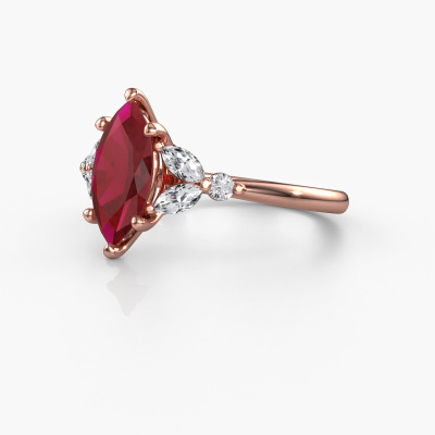 The ring shown above is called the Megan MRQ. We call this type of ring a pavé solitaire ring because it has one centre gemstone and a band that is also pave set with gemstones. This engagement ring is made in 14 Carat rose gold set with a 11x5.5 mm marquise ruby, and pave set lab-grown diamonds at the sides. Each piece of jewellery is made with passion and love by one of our master goldsmiths.This fantasy rose gold pavé solitaire engagement ring has an exquisite marquise ruby centre stone. To further accentuate the centre stone, the band is set full with more lab-grown diamonds. Its open prong setting allows light to strike the ruby from various angles and this adds sparkle to your ruby ring. The photo shown above depicts the goldsmith's carefully handcrafted details of the ring. The high positioning of the centre stone is truly eye-catching. The perfect engagement ring for the crown jewel of your life![bestp1v_long]Have you found a specific engagement ring somewhere which you would like to give to your loved one? Please feel free to express your wishes to our jewel designers because we would be honoured to turn your design into a fantasy engagement ring. You can follow the development of your ring design because we use 3D drawings. This gives you a realistic preview of how your design will look. You can also preorder a dummy. A dummy is a plastic ring, which can be shaped according your ring design. You can try it on and check if its width and size are suitable for you. We will gladly send you a non-binding offer, based on a fair price/ quality ratio. It will amaze you, considering the quality of the ring and gemstones.To make it easier for you, we offer a 30 day return policy. Check our terms and conditions.