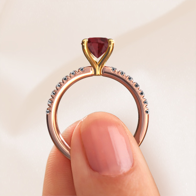 The ring shown above is called the Crystal RND 2. We call this type of ring a pavé solitaire ring because it has one centre gemstone and a band that is also pave set with gemstones. The 14 Carat rose gold engagement ring is set with a round 7 mm ruby centre stone and the band is pave set with lab grown diamond gemstones. Each jewel is unique in every way! Simply customize to your liking,This classic rose gold pavé solitaire engagement ring has an exquisite round ruby centre stone. To further accentuate the centre stone, the band is fully set with more lab-grown diamonds. Its open prong setting allows light to strike the ruby from various angles and this adds sparkle to your ruby ring. The photo shown above depicts the goldsmith's carefully handcrafted details of the ring. The high positioning of the centre stone is truly eye-catching. The perfect engagement ring for the crown jewel of your life! After receiving your order, our goldsmiths will start the creative process of making your Crystal RND 2 engagement ring. We don't keep stock. This is advantageous because these costs will not be passed on to you. Therefore, we can offer jewellery at exceptionally low prices.Different styles of new rings are made daily by our team. Perhaps you have found a pavé solitaire engagement ring somewhere. One you would like to give to your loved one. Please feel free to share your thoughts and design with our jewel designers. We would love to turn your design into a classic engagement ring. You can follow the development of your ring design because we use very detailed 3D drawings. On top of that, you can order a dummy of the design. A dummy is a plastic ring, which can be shaped according your ring design. You can try it on and check if the engagement ring is up to standard. We will gladly send you a non-binding offer, based on a fair price/ quality ratio. The offer will baffle you, considering the quality of the ring and gemstones.To make it easier for you, we offer a 30 day return policy. Check our terms and conditions.