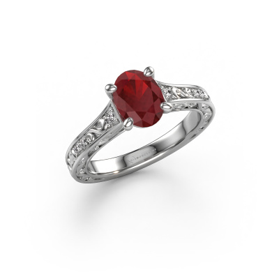 The ring shown above is called the Mallory ovl. We call this type of ring a pavé solitaire ring because it has one centre gemstone and a band that is also pave set with gemstones. This engagement ring is made in 14 Carat white gold set with a 8x6 mm oval ruby, and pave set lab-grown diamonds at the sides. Each piece of jewellery is made with passion and love by one of our master goldsmiths.This traditional white gold pavé solitaire engagement ring has an exquisite oval ruby centre stone. To further accentuate the centre stone, the band is set full with more lab-grown diamonds. Its open prong setting allows light to strike the ruby from various angles and this adds sparkle to your ruby ring. The photo shown above depicts the goldsmith's carefully handcrafted details of the ring. The high positioning of the centre stone is truly eye-catching. The perfect engagement ring for the crown jewel of your life!Are you on a budget? Please feel free to contact us, so we can go discuss your options. We offer our engagement rings at guaranteed best price, because we make them to order. You won't find such a price anywhere else!Our team adds new designs to our online collection daily. Our designers and goldsmiths work together in creating the best design. We strive to offer a diverse collection of jewels. Perhaps you have a specific jewel design in mind. One you came across somewhere. Please contact us for a free consultation. We will make you an offer, based on a fair price/ quality ratio, that will baffle you.To make it easier for you, we offer a 30 day return policy. Check our terms and conditions.