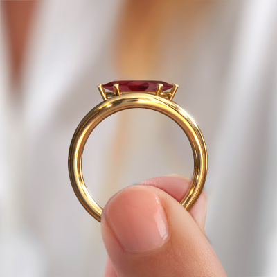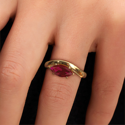 This 14 Carat gold ring is called Floor MRQ and is set with 11x5.5 mm ruby. What is it that makes your relationship unique? What is it about her that makes you want to bend down on one knee? The unique bond between the two of you is emphasized by an