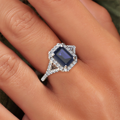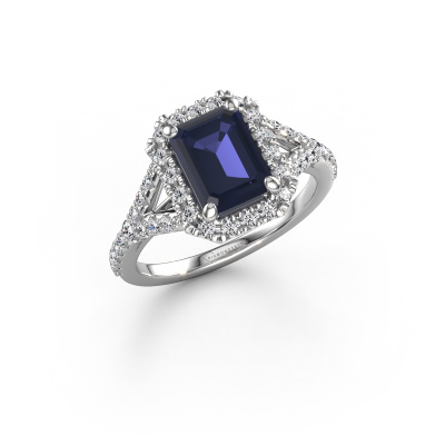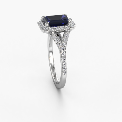 The ring shown above is called the Kimber EME. We call this type of ring a pavé solitaire ring because it has one centre gemstone and a band that is also pave set with gemstones. The platinum engagement ring is set with a emerald cut 8x6 mm sapphire centre stone and the band is pave set with lab grown diamond gemstones. Each jewel is made by a team of passionate goldsmiths and jewel designers. This will make your crown jewel truly eye-catching.This exclusive platinum pavé solitaire engagement ring has an exquisite emerald cut sapphire centre stone. To further accentuate the centre stone, the band is fully set with more lab-grown diamonds. Its open prong setting allows light to strike the sapphire from various angles and this adds sparkle to your sapphire ring. The photo shown above depicts the goldsmith's carefully handcrafted details of the ring. The high positioning of the centre stone is truly eye-catching. The perfect engagement ring for the crown jewel of your life! By using a combination of the latest modern techniques, combined with ancient crafting, we can make all our engagement rings in our own studio. Each jewel is made to order. This is advantageous because we can offer you a price you won't find anywhere else.Our team adds new designs to our online collection daily. Our designers and goldsmiths work together in creating the best design. We strive to offer a diverse collection of jewels. Perhaps you have a specific jewel design in mind. One you came across somewhere. Please contact us for a free consultation. We will make you an offer, based on a fair price/ quality ratio, that will baffle you.To make it easier for you, we offer a 30 day return policy. Check our terms and conditions.