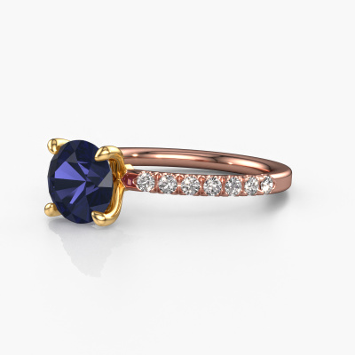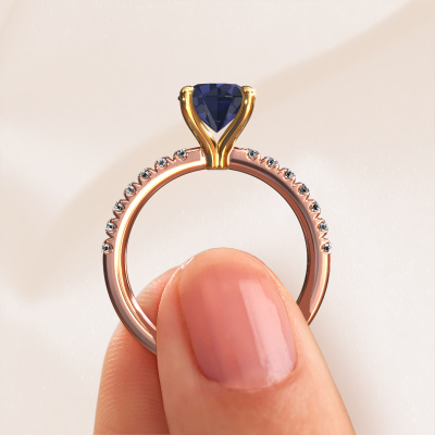The ring shown above is called the Crystal RND 2. We call this type of ring a pavé solitaire ring because it has one centre gemstone and a band that is also pave set with gemstones. The 14 Carat rose gold engagement ring is set with a round 7.3 mm sapphire centre stone and the band is pave set with lab grown diamond gemstones. Each jewel is unique in every way! Simply customize to your liking,This classic rose gold pavé solitaire engagement ring has an exquisite round sapphire centre stone. To further accentuate the centre stone, the band is fully set with more lab-grown diamonds. Its open prong setting allows light to strike the sapphire from various angles and this adds sparkle to your sapphire ring. The photo shown above depicts the goldsmith's carefully handcrafted details of the ring. The high positioning of the centre stone is truly eye-catching. The perfect engagement ring for the crown jewel of your life! After receiving your order, our goldsmiths will start the creative process of making your Crystal RND 2 engagement ring. We don't keep stock. This is advantageous because these costs will not be passed on to you. Therefore, we can offer jewellery at exceptionally low prices.Different styles of new rings are made daily by our team. Perhaps you have found a pavé solitaire engagement ring somewhere. One you would like to give to your loved one. Please feel free to share your thoughts and design with our jewel designers. We would love to turn your design into a classic engagement ring. You can follow the development of your ring design because we use very detailed 3D drawings. On top of that, you can order a dummy of the design. A dummy is a plastic ring, which can be shaped according your ring design. You can try it on and check if the engagement ring is up to standard. We will gladly send you a non-binding offer, based on a fair price/ quality ratio. The offer will baffle you, considering the quality of the ring and gemstones.To make it easier for you, we offer a 30 day return policy. Check our terms and conditions.