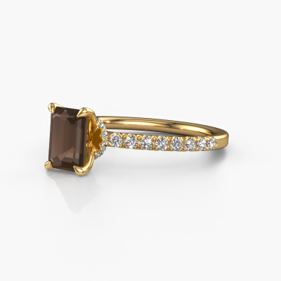 The ring shown above is called the Crystal EME 4. We call this type of ring a pavé solitaire ring because it has one centre gemstone and a band that is also pave set with gemstones. The 14 Carat gold engagement ring is set with a emerald cut 7x5 mm smokey quartz centre stone and the band is pave set with lab grown diamond gemstones. Each jewel is created to add sparkle to your finger, each jewel is lovingly made by hand by our goldsmiths.This fashionable gold pavé solitaire engagement ring has an exquisite emerald cut smokey quartz centre stone. To further accentuate the centre stone, the band is fully set with more lab-grown diamonds. Its open prong setting allows light to strike the smokey quartz from various angles and this adds sparkle to your smokey quartz ring. The photo shown above depicts the goldsmith's carefully handcrafted details of the ring. The high positioning of the centre stone is truly eye-catching. The perfect engagement ring for the crown jewel of your life! After receiving your order, our goldsmiths will passionately start the creative process of making your engagement ring in our own studio. Because we don't have a big stockpile, these costs will not be passed on to you. Our pricing is proof of that! We offer top quality jewels at lowest price, guaranteed.Our team adds new designs to our online collection daily. Our designers and goldsmiths work together in creating the best design. We strive to offer a diverse collection of jewels. Perhaps you have a specific jewel design in mind. One you came across somewhere. Please contact us for a free consultation. We will make you an offer, based on a fair price/ quality ratio, that will baffle you.To make it easier for you, we offer a 30 day return policy. Check our terms and conditions.