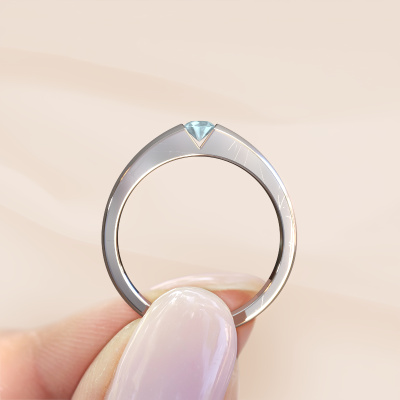 This platinum ring is called Theresia and is set with 3.4 mm aquamarine. The tension setting is what makes this a special engagement ring because it emphasizes the aquamarine. Our expert goldsmith uses special techniques to set the aquamarine in this platinum ring. By using these techniques, light reflects freely. This gives the ring its maximum shine and a glamorous appearance. A true work of art! The result is a unique ring, with a trendy appearance, passionately handcrafted to perfection by our expert goldsmith. A one-of-a-kind ring, designed for the love of your life. We recommend a solid gemstone, such as a diamond or sapphire, if you select this ring. The ring must be able to endure a lot of pressure during manufacturing. This piece of jewelry is made just for you by our master goldsmiths in our own studio.By using our modern techniques, we can design and customize the finest quality jewels with the utmost care for you. Our engagement rings are always priced 30 percent lower than other jewellers. We make engagement rings to order so we don't have to maintain a large stock. If you have a certain budget, we are more than happy to advice you accordingly.Different styles of new rings are made daily by our team. Perhaps you have found a solitaire engagement ring somewhere. One you would like to give to your loved one. Please feel free to share your thoughts and design with our jewel designers. We would love to turn your design into a modern engagement ring. You can follow the development of your ring design because we use very detailed 3D drawings. On top of that, you can order a dummy of the design. A dummy is a plastic ring, which can be shaped according your ring design. You can try it on and check if the engagement ring is up to standard. We will gladly send you a non-binding offer, based on a fair price/ quality ratio. The offer will baffle you, considering the quality of the ring and gemstones.To make it easier for you, we offer a 30 day return policy. Check our terms and conditions.