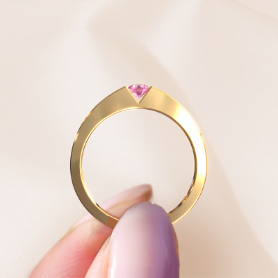 This 14 Carat gold ring is called Lizzy 1 and is set with pink sapphire. Do you keep up with the latest fashion trends? Do you want a unique engagement ring that matches your lifestyle? This edgy engagement ring is an extraordinary ring which can be custom-made to fit your or her personal style. This modern gold engagement ring is set with pink sapphire. Our pink sapphire are carefully selected for this specific ring in order to create the best effect. Our expert goldsmith will create your ring in our own artisan studio where the pink sapphire will be set with great care. The ring will then be polished to perfection. Nothing but the best for the love of your life! This jewel is created to add sparkle to your finger, each jewel is lovingly made by hand by our goldsmiths.By using our modern techniques, we can design and customize the finest quality jewels with the utmost care for you. Our engagement rings are always priced 30 percent lower than other jewellers. We make engagement rings to order so we don't have to maintain a large stock. If you have a certain budget, we are more than happy to advice you accordingly.Do you have a specific ring in mind? One you came across somewhere. Please feel free to tell us your wishes and we will turn your design into a unique engagement ring. You can follow the development of your ring design because we use 3D drawings. This gives you a realistic preview of your design. We will gladly send you a non-binding offer, based on a fair price/ quality ratio. It will amaze you.To make it easier for you, we offer a 30 day return policy. Check our terms and conditions.