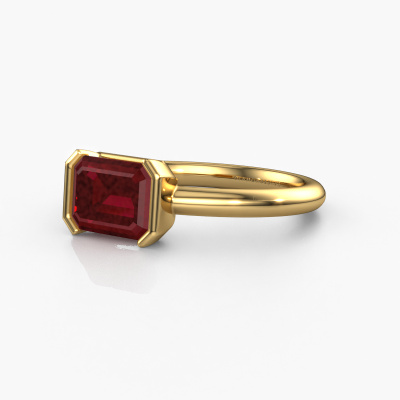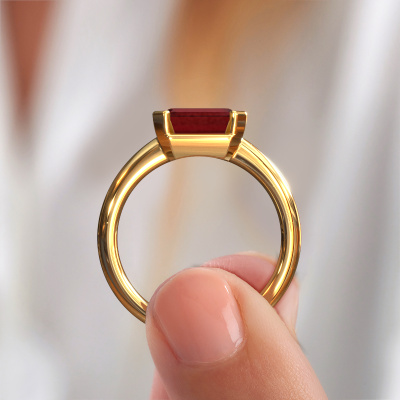 The ring shown above is called the Tayler EME, we call this a solitaire ring because it contains a single gemstone. The engagement ring is made in 14 Carat gold and has a emerald cut ruby of 8x6 mm. This modern gold solitaire ring with exquisite emerald cut ruby is a beautiful engagement ring. The open prong setting allows light to strike the gemstone from various angles. The ring also stands out because of the high positioning of the gemstone. Because diamonds symbolize true love and purity, they make the perfect gift for the love of your life. The symbol of eternal love is the centerpiece of this solitaire ring. Like a diamond, all other types of precious metal have their own attributed symbolic meaning. You can compile the solitaire engagement ring yourself in various precious metal combinations. This one has the combination of 14 Carat gold with gold. Each piece of jewelry is created to add sparkle to your finger, each jewel is lovingly made by hand by our goldsmiths.After receiving your order, our goldsmiths will passionately start the creative process of making your engagement ring in our own studio. Because we don't have a big stockpile, these costs will not be passed on to you. Our pricing is proof of that! We offer top quality jewels at lowest price, guaranteed.Our designers and goldsmiths work together each day, creating new jewels. Perhaps you have found a nice modern engagement ring somewhere, which can be used to customize your unique ring. Please feel free to contact us. We will make you an offer, based on a fair price/ quality ratio, which will amaze you.To make it easier for you, we offer a 30 day return policy. Check our terms and conditions.