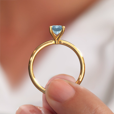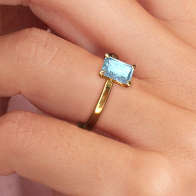 The ring shown above is called the Crystal RAD 1, we call this a solitaire ring because it contains a single gemstone. The engagement ring is made in 14 Carat gold and has a radiant blue lab grown diamond of 7x5 mm. This modern gold solitaire ring with exquisite radiant blue lab grown diamond is a beautiful engagement ring. The open prong setting allows light to strike the gemstone from various angles. The ring also stands out because of the high positioning of the gemstone. Because diamonds symbolize true love and purity, they make the perfect gift for the love of your life. The symbol of eternal love is the centerpiece of this solitaire ring. Like a diamond, all other types of precious metal have their own attributed symbolic meaning. You can compile the solitaire engagement ring yourself in various precious metal combinations. This one has the combination of 14 Carat gold with gold. Each piece of jewelry is made by a team of passionate goldsmiths and jewel designers. This will make your crown jewel truly eye-catching.After receiving your order, our goldsmiths will passionately start the creative process of making your engagement ring in our own studio. Because we don't have a big stockpile, these costs will not be passed on to you. Our pricing is proof of that! We offer top quality jewels at lowest price, guaranteed.Have you found a specific engagement ring somewhere which you would like to give to your loved one? Please feel free to express your wishes to our jewel designers because we would be honoured to turn your design into a modern engagement ring. You can follow the development of your ring design because we use 3D drawings. This gives you a realistic preview of how your design will look. You can also preorder a dummy. A dummy is a plastic ring, which can be shaped according your ring design. You can try it on and check if its width and size are suitable for you. We will gladly send you a non-binding offer, based on a fair price/ quality ratio. It will amaze you, considering the quality of the ring and gemstones.To make it easier for you, we offer a 30 day return policy. Check our terms and conditions.
