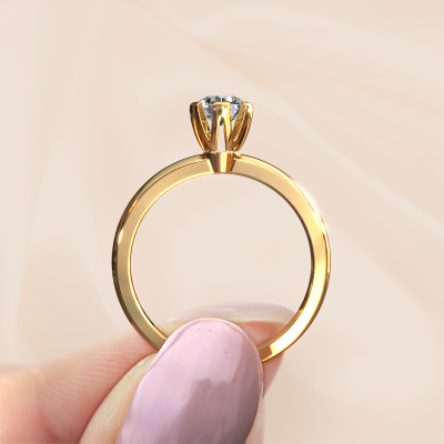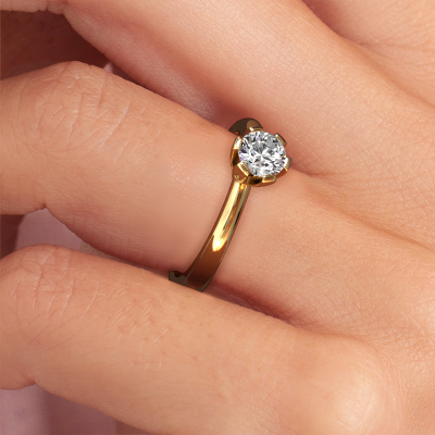 The ring shown above is called the Julia, we call this a solitaire ring because it contains a single gemstone. The engagement ring is made in 14 Carat gold and has a round diamond of 0.40 crt. This trendy gold solitaire ring with exquisite round diamond is a beautiful engagement ring. The open prong setting allows light to strike the gemstone from various angles. The ring also stands out because of the high positioning of the gemstone. Because diamonds symbolize true love and purity, they make the perfect gift for the love of your life. The symbol of eternal love is the centerpiece of this solitaire ring. Like a diamond, all other types of precious metal have their own attributed symbolic meaning. You can compile the solitaire engagement ring yourself in various precious metal combinations. This one has the combination of 14 Carat gold with gold. Each piece of jewelry is created to add sparkle to your finger, each jewel is lovingly made by hand by our goldsmiths.Are you on a budget? Please feel free to contact us, so we can go discuss your options. We offer our engagement rings at guaranteed best price, because we make them to order. You won't find such a price anywhere else!Different styles of new rings are made daily by our team. Perhaps you have found a solitaire engagement ring somewhere. One you would like to give to your loved one. Please feel free to share your thoughts and design with our jewel designers. We would love to turn your design into a trendy engagement ring. You can follow the development of your ring design because we use very detailed 3D drawings. On top of that, you can order a dummy of the design. A dummy is a plastic ring, which can be shaped according your ring design. You can try it on and check if the engagement ring is up to standard. We will gladly send you a non-binding offer, based on a fair price/ quality ratio. The offer will baffle you, considering the quality of the ring and gemstones.To make it easier for you, we offer a 30 day return policy. Check our terms and conditions.