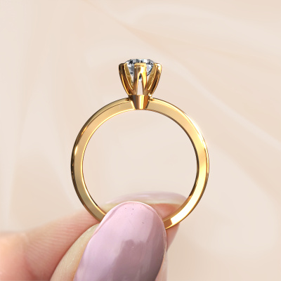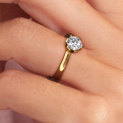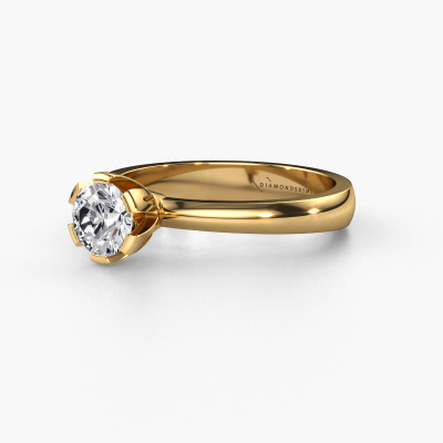 The ring shown above is called the Julia, we call this a solitaire ring because it contains a single gemstone. The engagement ring is made in 14 Carat gold and has a round lab grown diamond of 0.70 crt. This trendy gold solitaire ring with exquisite round lab grown diamond is a beautiful engagement ring. The open prong setting allows light to strike the gemstone from various angles. The ring also stands out because of the high positioning of the gemstone. Because diamonds symbolize true love and purity, they make the perfect gift for the love of your life. The symbol of eternal love is the centerpiece of this solitaire ring. Like a diamond, all other types of precious metal have their own attributed symbolic meaning. You can compile the solitaire engagement ring yourself in various precious metal combinations. This one has the combination of 14 Carat gold with gold. Each piece of jewelry is created to add sparkle to your finger, each jewel is lovingly made by hand by our goldsmiths.Are you on a budget? Please feel free to contact us, so we can go discuss your options. We offer our engagement rings at guaranteed best price, because we make them to order. You won't find such a price anywhere else!Different styles of new rings are made daily by our team. Perhaps you have found a solitaire engagement ring somewhere. One you would like to give to your loved one. Please feel free to share your thoughts and design with our jewel designers. We would love to turn your design into a trendy engagement ring. You can follow the development of your ring design because we use very detailed 3D drawings. On top of that, you can order a dummy of the design. A dummy is a plastic ring, which can be shaped according your ring design. You can try it on and check if the engagement ring is up to standard. We will gladly send you a non-binding offer, based on a fair price/ quality ratio. The offer will baffle you, considering the quality of the ring and gemstones.To make it easier for you, we offer a 30 day return policy. Check our terms and conditions.