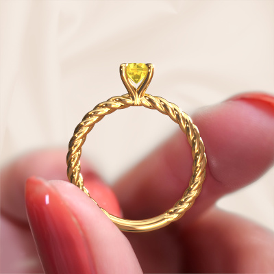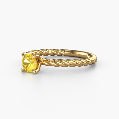 The ring shown above is called the Twanna, we call this a solitaire ring because it contains a single gemstone. The engagement ring is made in 14 Carat gold and has a round yellow sapphire of 5 mm. This fantasy gold solitaire ring with exquisite round yellow sapphire is a beautiful engagement ring. The open prong setting allows light to strike the gemstone from various angles. The ring also stands out because of the high positioning of the gemstone. Because diamonds symbolize true love and purity, they make the perfect gift for the love of your life. The symbol of eternal love is the centerpiece of this solitaire ring. Like a diamond, all other types of precious metal have their own attributed symbolic meaning. You can compile the solitaire engagement ring yourself in various precious metal combinations. This one has the combination of 14 Carat gold with gold. Each piece of jewelry is made by a team of passionate goldsmiths and jewel designers. This will make your crown jewel truly eye-catching.After receiving your order, our goldsmiths will passionately start the creative process of making your engagement ring in our own studio. Because we don't have a big stockpile, these costs will not be passed on to you. Our pricing is proof of that! We offer top quality jewels at lowest price, guaranteed.Do you have a specific ring in mind? One you came across somewhere. Please feel free to tell us your wishes and we will turn your design into a unique engagement ring. You can follow the development of your ring design because we use 3D drawings. This gives you a realistic preview of your design. We will gladly send you a non-binding offer, based on a fair price/ quality ratio. It will amaze you.To make it easier for you, we offer a 30 day return policy. Check our terms and conditions.