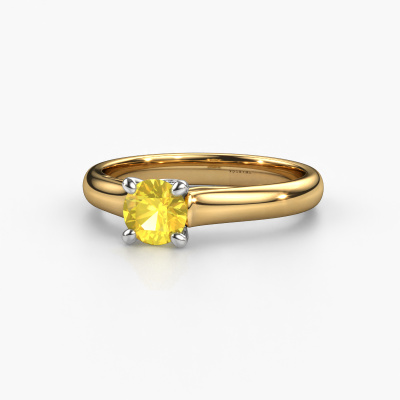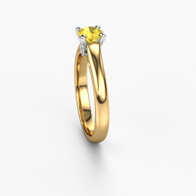 The ring shown above is called the Valorie RND 1, we call this a solitaire ring because it contains a single gemstone. The engagement ring is made in 14 Carat gold and has a round yellow sapphire of 5 mm. This modern gold solitaire ring with exquisite round yellow sapphire is a beautiful engagement ring. The open prong setting allows light to strike the gemstone from various angles. The ring also stands out because of the high positioning of the gemstone. Because diamonds symbolize true love and purity, they make the perfect gift for the love of your life. The symbol of eternal love is the centerpiece of this solitaire ring. Like a diamond, all other types of precious metal have their own attributed symbolic meaning. You can compile the solitaire engagement ring yourself in various precious metal combinations. This one has the combination of 14 Carat gold with white gold. Each piece of jewelry is made just for you, with attention to detail and design.By using our modern techniques, we can design and customize the finest quality jewels with the utmost care for you. Our engagement rings are always priced 30 percent lower than other jewellers. We make engagement rings to order so we don't have to maintain a large stock. If you have a certain budget, we are more than happy to advice you accordingly.Do you have a specific ring in mind? One you came across somewhere. Please feel free to tell us your wishes and we will turn your design into a unique engagement ring. You can follow the development of your ring design because we use 3D drawings. This gives you a realistic preview of your design. We will gladly send you a non-binding offer, based on a fair price/ quality ratio. It will amaze you.To make it easier for you, we offer a 30 day return policy. Check our terms and conditions.