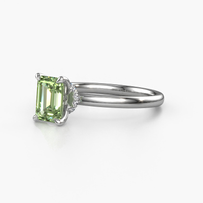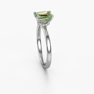 The ring shown above is called the Crystal EME 3, we call this a solitaire ring because it contains a single gemstone. The engagement ring is made in platinum and has a emerald cut green lab grown diamond of 7x5 mm. This classic platinum solitaire ring with exquisite emerald cut green lab grown diamond is a beautiful engagement ring. The open prong setting allows light to strike the gemstone from various angles. The ring also stands out because of the high positioning of the gemstone. Because diamonds symbolize true love and purity, they make the perfect gift for the love of your life. The symbol of eternal love is the centerpiece of this solitaire ring. Like a diamond, all other types of precious metal have their own attributed symbolic meaning. You can compile the solitaire engagement ring yourself in various precious metal combinations. This one has the combination of platinum with platinum. Each piece of jewelry is made by a team of passionate goldsmiths and jewel designers. This will make your crown jewel truly eye-catching.By using our modern techniques, we can design and customize the finest quality jewels with the utmost care for you. Our engagement rings are always priced 30 percent lower than other jewellers. We make engagement rings to order so we don't have to maintain a large stock. If you have a certain budget, we are more than happy to advice you accordingly.Do you have a specific ring in mind? One you came across somewhere. Please feel free to tell us your wishes and we will turn your design into a unique engagement ring. You can follow the development of your ring design because we use 3D drawings. This gives you a realistic preview of your design. We will gladly send you a non-binding offer, based on a fair price/ quality ratio. It will amaze you.To make it easier for you, we offer a 30 day return policy. Check our terms and conditions.