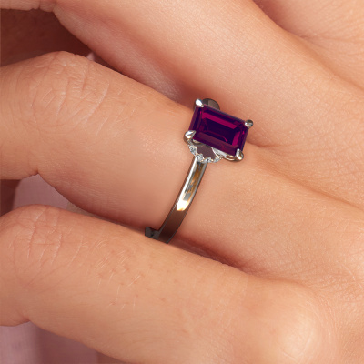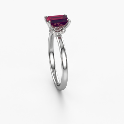 The ring shown above is called the Crystal EME 3, we call this a solitaire ring because it contains a single gemstone. The engagement ring is made in platinum and has a emerald cut rhodolite of 7x5 mm. This classic platinum solitaire ring with exquisite emerald cut rhodolite is a beautiful engagement ring. The open prong setting allows light to strike the gemstone from various angles. The ring also stands out because of the high positioning of the gemstone. Because diamonds symbolize true love and purity, they make the perfect gift for the love of your life. The symbol of eternal love is the centerpiece of this solitaire ring. Like a diamond, all other types of precious metal have their own attributed symbolic meaning. You can compile the solitaire engagement ring yourself in various precious metal combinations. This one has the combination of platinum with platinum. Each piece of jewelry is made by a team of passionate goldsmiths and jewel designers. This will make your crown jewel truly eye-catching.By using our modern techniques, we can design and customize the finest quality jewels with the utmost care for you. Our engagement rings are always priced 30 percent lower than other jewellers. We make engagement rings to order so we don't have to maintain a large stock. If you have a certain budget, we are more than happy to advice you accordingly.Do you have a specific ring in mind? One you came across somewhere. Please feel free to tell us your wishes and we will turn your design into a unique engagement ring. You can follow the development of your ring design because we use 3D drawings. This gives you a realistic preview of your design. We will gladly send you a non-binding offer, based on a fair price/ quality ratio. It will amaze you.To make it easier for you, we offer a 30 day return policy. Check our terms and conditions.