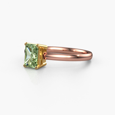 The ring shown above is called the Denita 1 RAD, we call this a solitaire ring because it contains a single gemstone. The engagement ring is made in 14 Carat rose gold and has a radiant green lab grown diamond of 6.5x4.5 mm. This modern rose gold solitaire ring with exquisite radiant green lab grown diamond is a beautiful engagement ring. The open prong setting allows light to strike the gemstone from various angles. The ring also stands out because of the high positioning of the gemstone. Because diamonds symbolize true love and purity, they make the perfect gift for the love of your life. The symbol of eternal love is the centerpiece of this solitaire ring. Like a diamond, all other types of precious metal have their own attributed symbolic meaning. You can compile the solitaire engagement ring yourself in various precious metal combinations. This one has the combination of 14 Carat rose gold with gold. Each piece of jewelry is made just for you, with attention to detail and design.After receiving your order, our goldsmiths will start the creative process of making your Denita 1 RAD engagement ring. We don't keep stock. This is advantageous because these costs will not be passed on to you. Therefore, we can offer jewellery at exceptionally low prices.Our designers and goldsmiths work together each day, creating new jewels. Perhaps you have found a nice modern engagement ring somewhere, which can be used to customize your unique ring. Please feel free to contact us. We will make you an offer, based on a fair price/ quality ratio, which will amaze you.To make it easier for you, we offer a 30 day return policy. Check our terms and conditions.