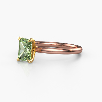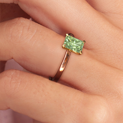 The ring shown above is called the Crystal RAD 1, we call this a solitaire ring because it contains a single gemstone. The engagement ring is made in 14 Carat rose gold and has a radiant green lab grown diamond of 7x5 mm. This modern rose gold solitaire ring with exquisite radiant green lab grown diamond is a beautiful engagement ring. The open prong setting allows light to strike the gemstone from various angles. The ring also stands out because of the high positioning of the gemstone. Because diamonds symbolize true love and purity, they make the perfect gift for the love of your life. The symbol of eternal love is the centerpiece of this solitaire ring. Like a diamond, all other types of precious metal have their own attributed symbolic meaning. You can compile the solitaire engagement ring yourself in various precious metal combinations. This one has the combination of 14 Carat rose gold with gold. Each piece of jewelry is made by a team of passionate goldsmiths and jewel designers. This will make your crown jewel truly eye-catching.After receiving your order, our goldsmiths will passionately start the creative process of making your engagement ring in our own studio. Because we don't have a big stockpile, these costs will not be passed on to you. Our pricing is proof of that! We offer top quality jewels at lowest price, guaranteed.Have you found a specific engagement ring somewhere which you would like to give to your loved one? Please feel free to express your wishes to our jewel designers because we would be honoured to turn your design into a modern engagement ring. You can follow the development of your ring design because we use 3D drawings. This gives you a realistic preview of how your design will look. You can also preorder a dummy. A dummy is a plastic ring, which can be shaped according your ring design. You can try it on and check if its width and size are suitable for you. We will gladly send you a non-binding offer, based on a fair price/ quality ratio. It will amaze you, considering the quality of the ring and gemstones.To make it easier for you, we offer a 30 day return policy. Check our terms and conditions.