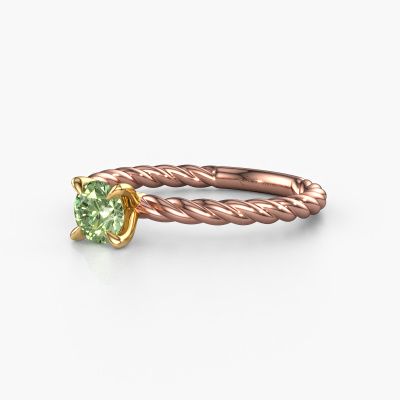 The ring shown above is called the Twanna, we call this a solitaire ring because it contains a single gemstone. The engagement ring is made in 14 Carat rose gold and has a round green lab grown diamond of 5 mm. This fantasy rose gold solitaire ring with exquisite round green lab grown diamond is a beautiful engagement ring. The open prong setting allows light to strike the gemstone from various angles. The ring also stands out because of the high positioning of the gemstone. Because diamonds symbolize true love and purity, they make the perfect gift for the love of your life. The symbol of eternal love is the centerpiece of this solitaire ring. Like a diamond, all other types of precious metal have their own attributed symbolic meaning. You can compile the solitaire engagement ring yourself in various precious metal combinations. This one has the combination of 14 Carat rose gold with gold. Each piece of jewelry is made by a team of passionate goldsmiths and jewel designers. This will make your crown jewel truly eye-catching.After receiving your order, our goldsmiths will passionately start the creative process of making your engagement ring in our own studio. Because we don't have a big stockpile, these costs will not be passed on to you. Our pricing is proof of that! We offer top quality jewels at lowest price, guaranteed.Do you have a specific ring in mind? One you came across somewhere. Please feel free to tell us your wishes and we will turn your design into a unique engagement ring. You can follow the development of your ring design because we use 3D drawings. This gives you a realistic preview of your design. We will gladly send you a non-binding offer, based on a fair price/ quality ratio. It will amaze you.To make it easier for you, we offer a 30 day return policy. Check our terms and conditions.