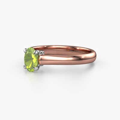 The ring shown above is called the Valorie ovl 1, we call this a solitaire ring because it contains a single gemstone. The engagement ring is made in 14 Carat rose gold and has a oval peridot of 6.5x4.5 mm. This modern rose gold solitaire ring with exquisite oval peridot is a beautiful engagement ring. The open prong setting allows light to strike the gemstone from various angles. The ring also stands out because of the high positioning of the gemstone. Because diamonds symbolize true love and purity, they make the perfect gift for the love of your life. The symbol of eternal love is the centerpiece of this solitaire ring. Like a diamond, all other types of precious metal have their own attributed symbolic meaning. You can compile the solitaire engagement ring yourself in various precious metal combinations. This one has the combination of 14 Carat rose gold with white gold. Each piece of jewelry is made just for you, with attention to detail and design.By using our modern techniques, we can design and customize the finest quality jewels with the utmost care for you. Our engagement rings are always priced 30 percent lower than other jewellers. We make engagement rings to order so we don't have to maintain a large stock. If you have a certain budget, we are more than happy to advice you accordingly.Do you have a specific ring in mind? One you came across somewhere. Please feel free to tell us your wishes and we will turn your design into a unique engagement ring. You can follow the development of your ring design because we use 3D drawings. This gives you a realistic preview of your design. We will gladly send you a non-binding offer, based on a fair price/ quality ratio. It will amaze you.To make it easier for you, we offer a 30 day return policy. Check our terms and conditions.