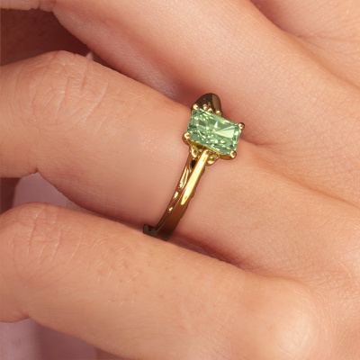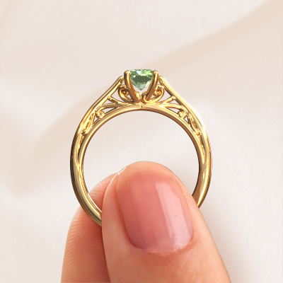 This 14 Carat gold ring is called Shannon rad and is set with 6.5x4.5 mm green lab grown diamond. An extraordinary gold vintage ring. One that will surely make the love of your life shine like a diamond! That is what we hope to achieve. This Celtic engagement ring is set with exquisite green lab grown diamond. Whichever gemstone you choose from our selection, is up to you. The gemstone is selected with great care because we believe your ajour engagement ring must be adorned with nothing but the most beautiful gemstone. Wouldn't you agree? Our expert goldsmith will design your ring in our own crafting studio, where the green lab grown diamond will be set with great precision. The ring will then be polished till it shines perfectly. Nothing but the best for the love of your life! This jewel is made to shine bright around your finger. Each jewel is hand made with love by our goldsmiths.Are you on a budget? Please feel free to contact us, so we can go discuss your options. We offer our engagement rings at guaranteed best price, because we make them to order. You won't find such a price anywhere else!Our team adds new designs to our online collection daily. Our designers and goldsmiths work together in creating the best design. We strive to offer a diverse collection of jewels. Perhaps you have a specific jewel design in mind. One you came across somewhere. Please contact us for a free consultation. We will make you an offer, based on a fair price/ quality ratio, that will baffle you.To make it easier for you, we offer a 30 day return policy. Check our terms and conditions.