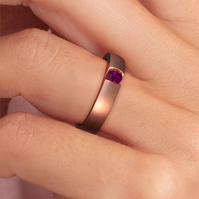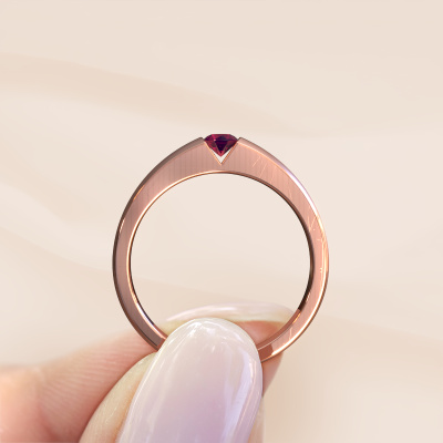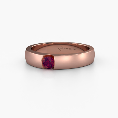 This 14 Carat rose gold ring is called Theresia and is set with 3.4 mm rhodolite. The tension setting is what makes this a special engagement ring because it emphasizes the rhodolite. Our expert goldsmith uses special techniques to set the rhodolite in this rose gold ring. By using these techniques, light reflects freely. This gives the ring its maximum shine and a glamorous appearance. A true work of art! The result is a unique ring, with a trendy appearance, passionately handcrafted to perfection by our expert goldsmith. A one-of-a-kind ring, designed for the love of your life. We recommend a solid gemstone, such as a diamond or sapphire, if you select this ring. The ring must be able to endure a lot of pressure during manufacturing. This piece of jewelry is made just for you by our master goldsmiths in our own studio.By using our modern techniques, we can design and customize the finest quality jewels with the utmost care for you. Our engagement rings are always priced 30 percent lower than other jewellers. We make engagement rings to order so we don't have to maintain a large stock. If you have a certain budget, we are more than happy to advice you accordingly.Different styles of new rings are made daily by our team. Perhaps you have found a solitaire engagement ring somewhere. One you would like to give to your loved one. Please feel free to share your thoughts and design with our jewel designers. We would love to turn your design into a modern engagement ring. You can follow the development of your ring design because we use very detailed 3D drawings. On top of that, you can order a dummy of the design. A dummy is a plastic ring, which can be shaped according your ring design. You can try it on and check if the engagement ring is up to standard. We will gladly send you a non-binding offer, based on a fair price/ quality ratio. The offer will baffle you, considering the quality of the ring and gemstones.To make it easier for you, we offer a 30 day return policy. Check our terms and conditions.