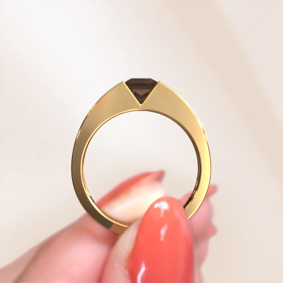 This 14 Carat gold ring is called Arlena 1 and is set with 4 mm smokey quartz. The tension setting is what makes this a special engagement ring because it emphasizes the smokey quartz. Our expert goldsmith uses special techniques to set the smokey quartz in this gold ring. By using these techniques, light reflects freely. This gives the ring its maximum shine and a glamorous appearance. A true work of art! The result is a unique ring, with a trendy appearance, passionately handcrafted to perfection by our expert goldsmith. A one-of-a-kind ring, designed for the love of your life. We recommend a solid gemstone, such as a diamond or sapphire, if you select this ring. The ring must be able to endure a lot of pressure during manufacturing. This piece of jewelry is made just for you, with attention to detail and design.By using a combination of the latest modern techniques, combined with ancient crafting, we can make all our engagement rings in our own studio. Each jewel is made to order. This is advantageous because we can offer you a price you won't find anywhere else.Do you have a specific ring in mind? One you came across somewhere. Please feel free to tell us your wishes and we will turn your design into a unique engagement ring. You can follow the development of your ring design because we use 3D drawings. This gives you a realistic preview of your design. We will gladly send you a non-binding offer, based on a fair price/ quality ratio. It will amaze you.To make it easier for you, we offer a 30 day return policy. Check our terms and conditions.